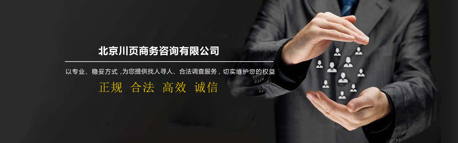 北京市侦探公司-北京川页商务咨询有限公司是面向全国提供找人寻人服务平台,公司致力于为企业、个人解决发展中各类债务问题、债权诉讼、债权转让事务,帮助快速寻找亲人、朋友、恋人、战友等找人服务,以及婚姻家庭情感咨询等业务。公司拥有一批律师,商账管理师专业的工作人员,依托互联网平台,在国内形成了完善的调查寻人服务网络,业务范围已经逐渐覆盖北京及全国各大主要城市和地区。我们始终秉承"捍卫真理、坚持诚信、以人为本、奉献社会"的服务理念和"专业、创新、和谐、共赢"的经营理念,我们希望通过提供全面、及时、准确、专业的相关信息,以优质的服务,专业的技巧,为各位有需求的人员提供服务!